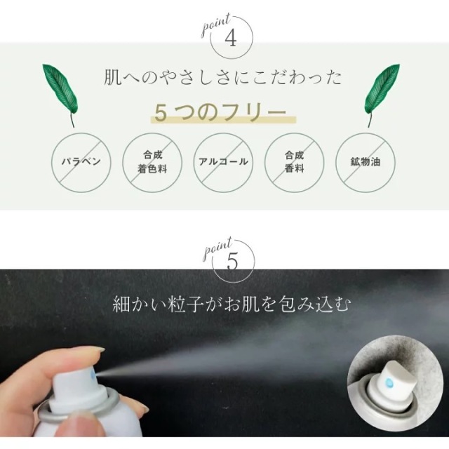 ・使用前に缶中の球がカチカチと音がするまで、上下に強く振り、肌や髪から10~15cmくらい離して適量をスプレーし、なじませます。