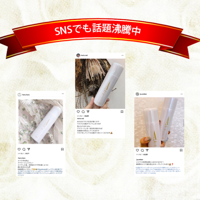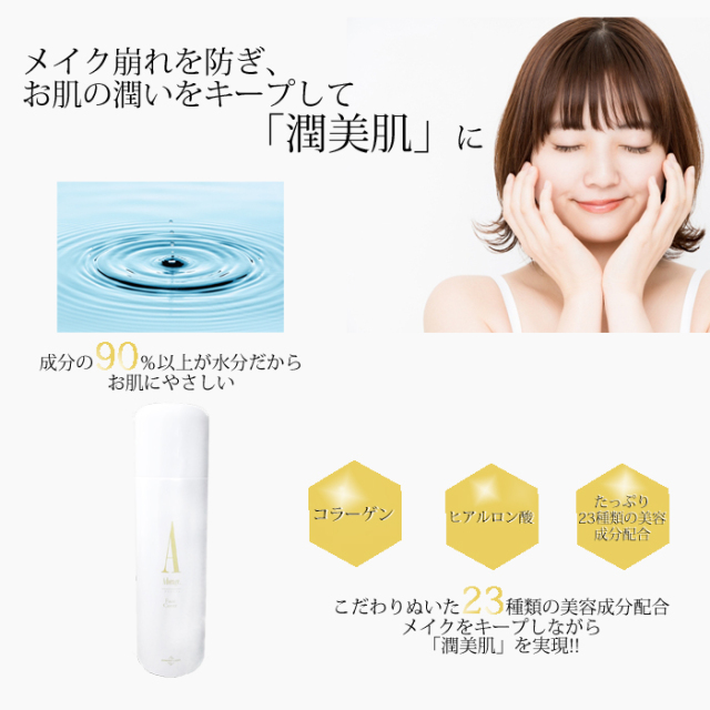 メイクのフィニッシュにひと吹き。 ご使用方法 メイク後、お肌から20cmほど離して、目を閉じて顔全体にスプレーした後、触らずに自然乾燥させて下さい。 生産国 日本 内容量 80ml 全成分 水,ポリクオタニウム-56,グリセリン,ポリクオタニウム-51,加水分解コンキオリン,ヒアルロン酸ヒドロキシプロピルトリモニウム,ヒアルロン酸Na,アルブチン,ローヤルゼリー,水溶性コラーゲン,プラセンタエキス,インドナガコショウ果実エキス,カラスムギ穀粒エキスムラサキ根エキス,オウゴン根エキス,アロエベラ葉エキスユーグレナエキス,白金,BG,パルミトイルペンタペプチド-4,オレアノール酸,ノルジヒドログアイアレチン酸,カプリリルグリコール,PGE-60,アーモンド脂肪酸グリセリルポリソリベート20,ポリソリベート80,カルボーマ,エタノール,フェノキシエタノール,エチルヘキシルグリセリン,メチルパラベン,エチルパラベン,プロピルパラベン,窒素使用方法 ・お肌に合わない時は、ご使用をおやめください。きず・はれもの・しっしん等、異常のある部位にはお使いにならないでください。 ・粘膜への使用は避け、使用中や使用後に赤みやはれ、刺激等の異常が現れた場合は使用を中止し、皮膚科専門医等へご相談されることをおすすめします。 ・目に入った場合は、こすらずにすぐに水かぬるま湯で洗い流してください。 ・直接吸い込まないよう注意してください。 ・お肌をタオル等でふいた後はつけ直してください。 ・携帯時にはキャップが外れ中身が出ることがあります。 ・衣類につかないようにご注意ください。衣類についた時は洗剤ですぐに洗ってください。塩素系漂白剤のご使用はおやめください。 ・捨てる時は火気のない屋外で噴射音が消えるまでボタンを押してガスを抜き、地域のルールに従って捨ててください。 区分 化粧品 広告文責 株式会社 アンバーラッシュ |